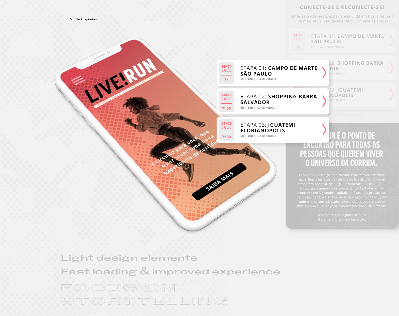 To reach a new audience and strengthen the brand's relationship with the community, LIVE! — a sportswear brand already well-established in southern Brazil — introduces LIVE! RUN. This street running series takes place throughout the year in different cities nationwide. The subscription is online, on the website designed especially for the project, which also serves as the gateway for new audiences to discover the brand.